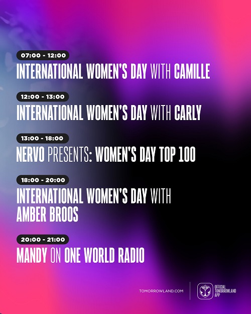 Listeners will be able to enjoy a day dedicated to all women out there with only tracks by female DJs & vocalists, as well as a unique line-up of special programs with only female hosts, featuring the 21-year-old Belgian rising techno star host Amber Broos, Belgian hard dance powerhouse MANDY, Australian twin sisters NERVO, One World Radio host Camille and UK DJ & brand-new One World Radio host Carly Wilford.